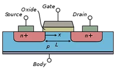 MOSFET - 기본 구조 및 동작, Threshold voltage 1. Basic NMOS의 구조와 동작 원리 - MOSFET (Metal-Oxide Semiconductor Field-Effect Transistor) : 굳이 풀어 쓰면 금속-산화 반도체 전계 효과 트랜지스터. ㄴ MOS? : 도핑된 반도체 기판 위에 SiO2로 된 절연층과 금속이 적층되어 있는 구조를 나타내는 말이다(MOSFET 개발 초기에는 게이트를 금속 소재로 사용했지만 최근에는 공정상 편의를 위해 폴리실리콘이 사용됨). 세로 방향으로 보면 금속-유전체-p형 반도체 순서로 적층되어 있음을 볼 수 있는데 이는 capacitor의 구조와 유사하다. ㄴ FET? : 이번에는 가로 방향으로 구조를 보자. n+, 즉 고농도로 도핑된 n-type인 source와 drain 사이에 p-type인 bo.. -