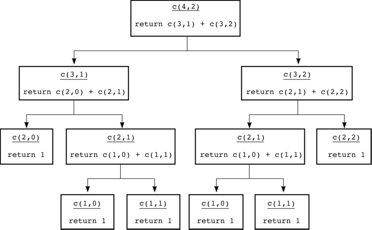 한편, 피보나치, combination처럼 subproblem이 중복되는 문제를 해결하는 방법은 "Dynamic Programming"이라고 한다. 중복 연산이 여러 번 수행되는 것을 방지하기 위해, 문제를 풀기 위한 모든 unique sub-problem을 먼저 구한 후 결괏값을 저장해 놓고 가져다 쓰는 Memoization이나 Tabulation 등의 기법을 추가로 사용한다.